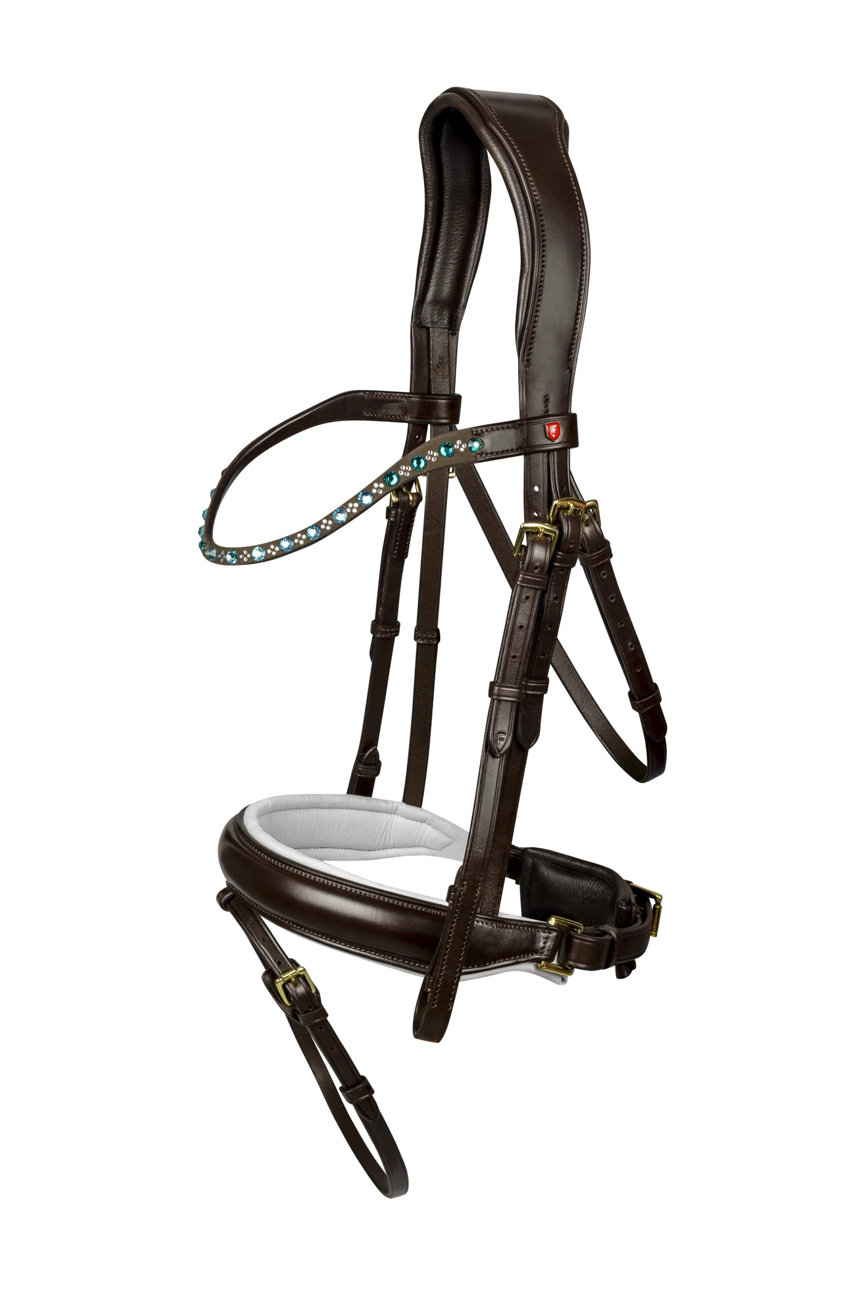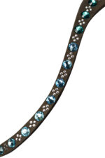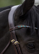 Ogłowie Equinox wykonane z wysokiej jakości miękkiej skórzanej włoskiej skóry, naczółek ozdobiony seledynowymi kamieniami, miękko podszyty  szwedzki nachrapnik oraz profilowana potylica zapewnia bardzo dobre dopasowanie.